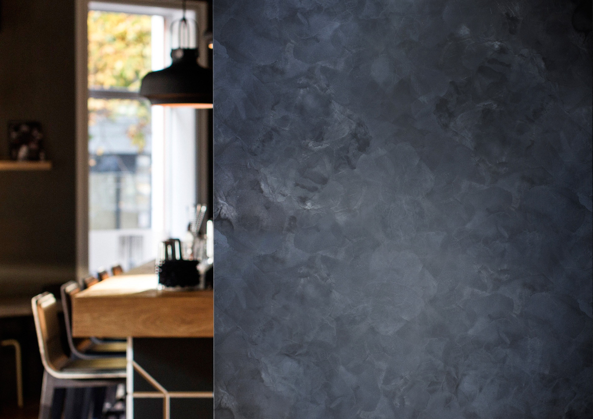 Decorative plaster with black velvet effect. The coating has a noble appearance of velvet fabric tested by time, which manifests itself in the form of natural scuffs and the depth of the pearly matte effect.