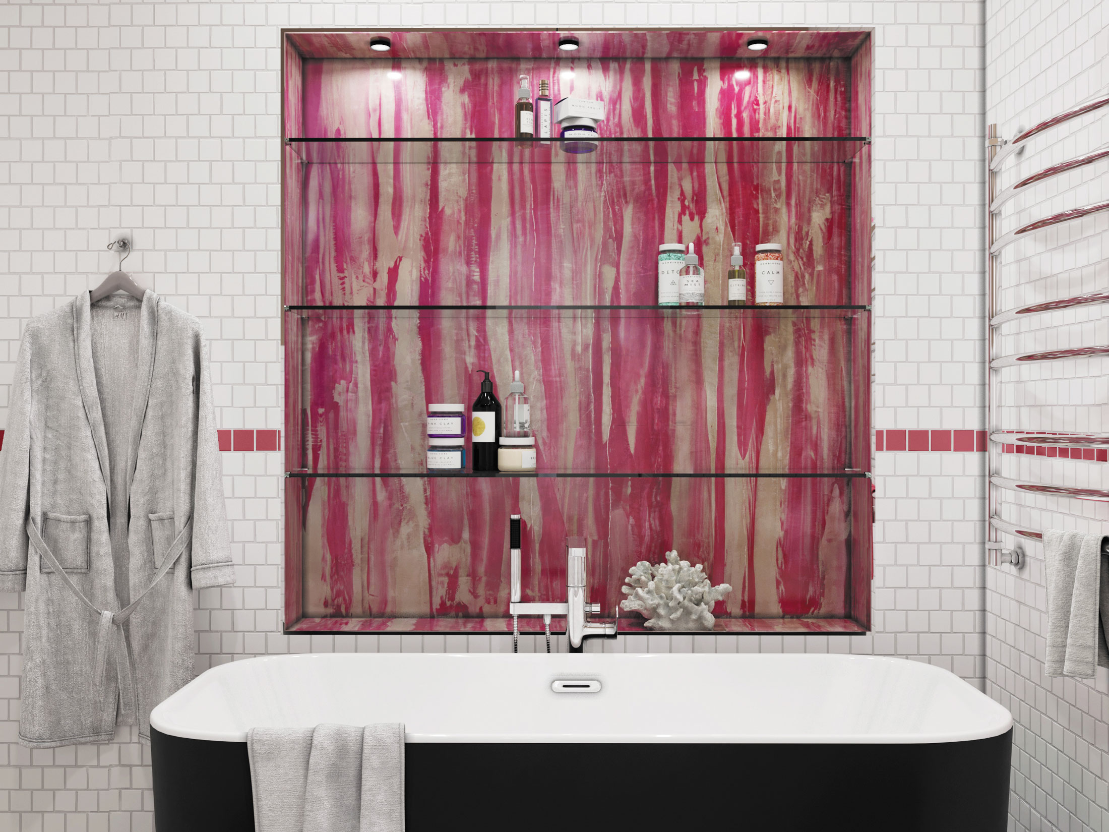 Venetian stucco in vintage colors with mirror polished effect. The coating has a high depth of texture. Resistance to abrasion and high humidity allows the use of coating for decorating walls and ceilings in bathrooms and swimming pools, including in areas of direct water.