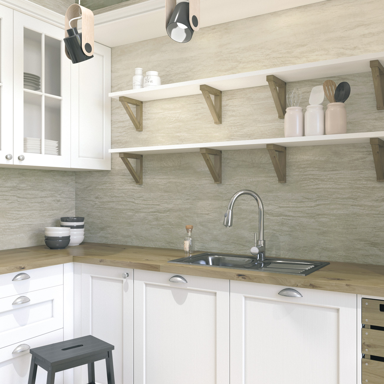 Decorative plaster with the effect of natural travertine. The decor has a matte and sometimes glossy, porous appearance with a high degree of protection against moisture, which allows it to be used as a wall and ceiling decoration for kitchens, bathrooms, pools, corridors or basements.