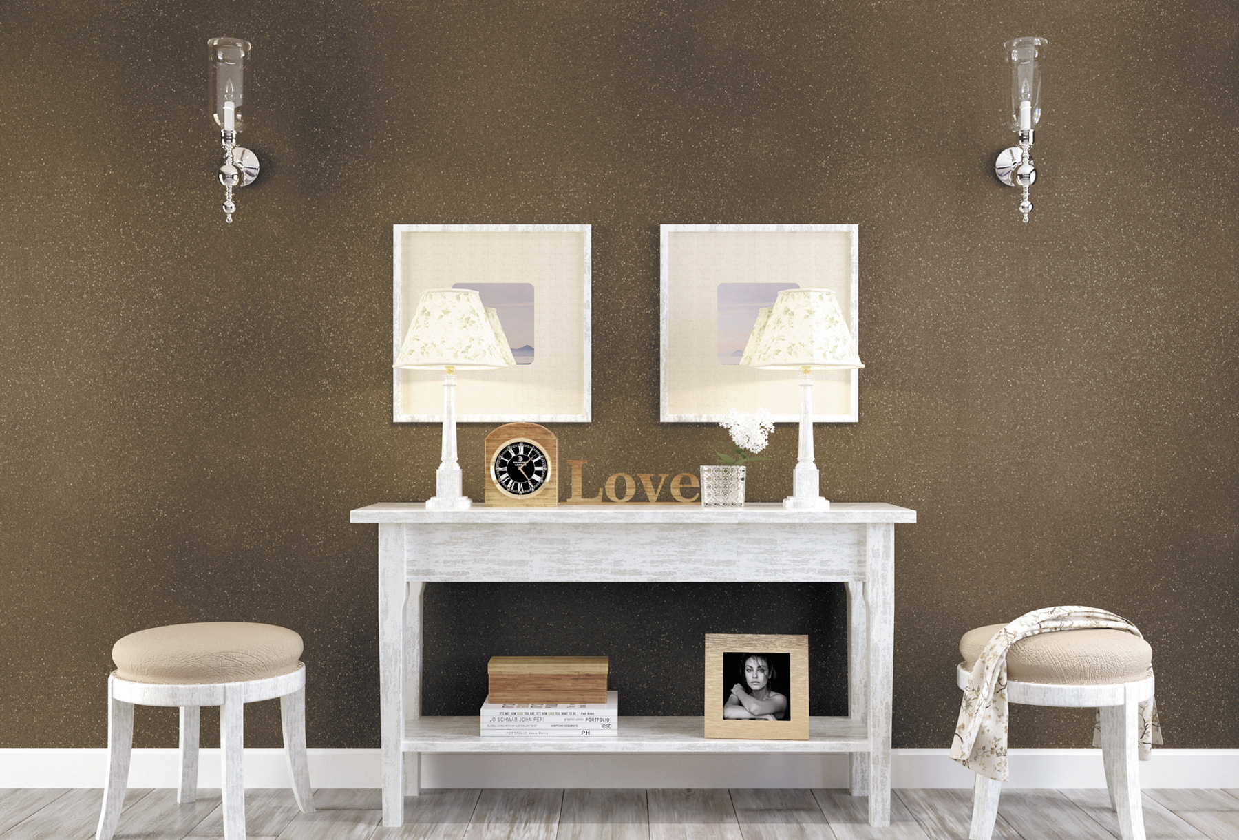 Matte decorative coating for walls and ceilings with the effect of silver sparkles. The material has a pleasant appearance with a lot of sparkles, resembling a scattering of diamonds.